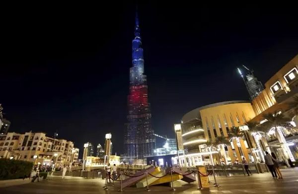 11.15日,周日晚上九点,哈利法塔亮起蓝白红旗,…