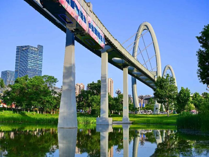 在武汉东湖高新区(又称“中国光谷”)九峰山站,一列无人驾驶的“樱花专列”在半空中“飞”过。海外华文媒体代表及中国香港作家代表一行5月14日走进中国光谷,感受生态科技创新魅力。