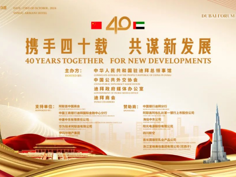 为庆祝中华人民共和国和阿拉伯联合酋长国建交40周年,进一步推动双方在各领域的交流与合作,中国驻迪拜总领馆携手中国公共外交协会、迪拜政府媒体办公室、迪拜商会将于10月23日在迪拜阿玛尼酒店举办“迪拜论坛”,围绕“携手四十载,共谋新发展”主题,打造公共平台,助力深化合作,共绘发展蓝图。